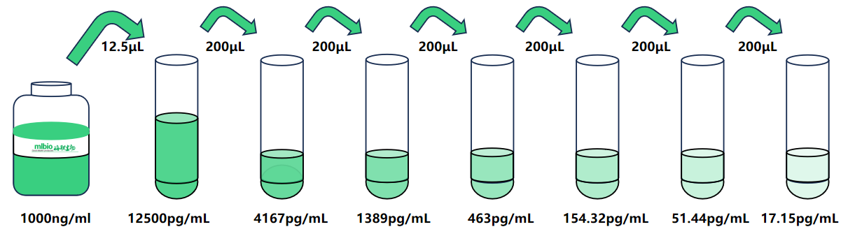 試劑盒中取出標(biāo)準(zhǔn)品,準(zhǔn)備7個試管,先將1000ng/mL標(biāo)準(zhǔn)品(200µL)按需吸取一定量用1×稀釋液稀釋至12500pg/mL(例:12.5µL的標(biāo)準(zhǔn)品母液+987.5µL的1×稀釋液,制備得到1000μL的12500pg/mL濃度標(biāo)準(zhǔn)品),隨后在6個試管中分別加入400μL的1×稀釋液,在這6個單獨(dú)的試管中將12500pg/mL標(biāo)準(zhǔn)品依次3倍倍比稀釋至7個梯度,共配制7個濃度的標(biāo)準(zhǔn)品,依次為:12500pg/mL、4167pg/mL、1389pg/mL、463pg/mL、154.32pg/mL、51.44pg/mL、17.15pg/mL,從最高濃度標(biāo)準(zhǔn)品溶液中吸取200μL標(biāo)準(zhǔn)品到下一個試管中,輕輕吹打混勻,以此類推進(jìn)行標(biāo)準(zhǔn)品的倍比稀釋(如圖所示),1×稀釋液用作零濃度標(biāo)準(zhǔn)品(0pg/mL)。