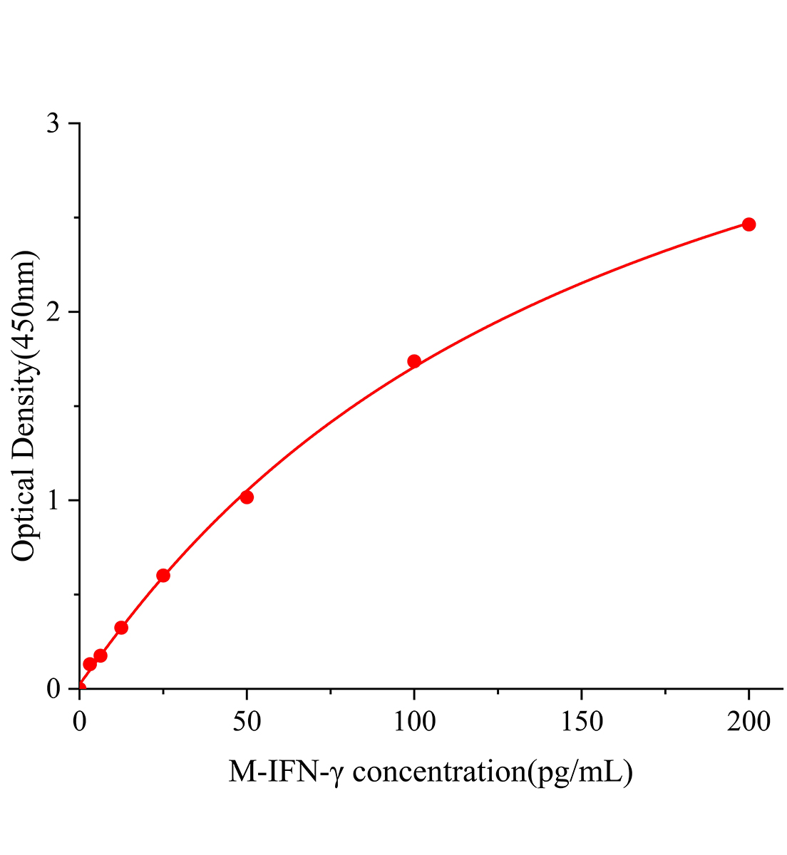 試劑盒采用雙抗體夾心法ELISA技術:將捕獲抗體包被于酶標板上,捕獲樣品及標準品中的待測物IFN-γ,孵育清洗后,再加入生物素標記的檢測抗體進行孵育后清洗,形成“捕獲抗體-抗原-檢測抗體”免疫復合物,隨后加入鏈霉親和素偶聯(lián)的辣根過氧化物酶進行孵育,待孵育結束后清洗,接著加入TMB顯色液后,若樣本中有待測物則顯藍色,則加入終止液停止反應。檢測過程中游離的成分均被洗去,用酶標儀在450nm處測OD值,顏色的深淺和樣品中的待測物的含量呈正比,通過繪制標準曲線計算出樣本中IFN-γ的濃度。